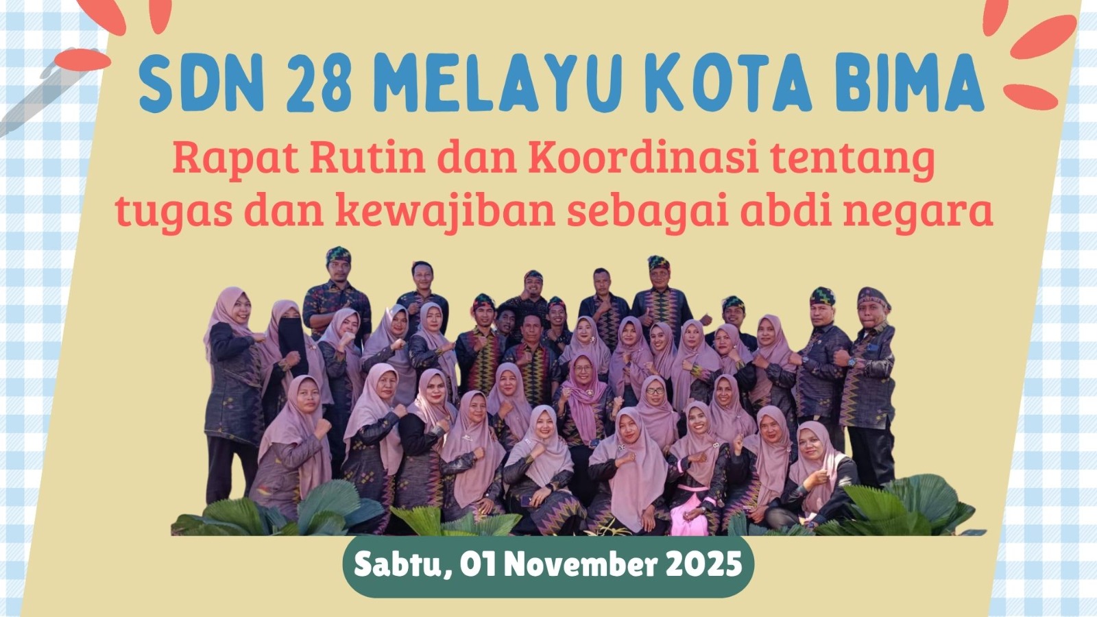 Bima, 1 November 2025 — Dalam rangka meningkatkan kinerja dan tanggung jawab sebagai abdi negara, SDN 28 Melayu Kota Bima menggelar rapat rutin dan koordinasi pada sabtu (01/11/2025). Kegiatan ini dihadiri oleh seluruh dewan guru dan staf tata usaha, dipimpin langsung oleh Kepala Sekolah SDN 28 Melayu.